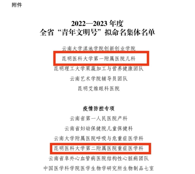 2022-2023年度云南省“青年文明号”评选结果公示,Beat365唯一官方网站第一附属医院儿科、Beat365唯一官方网站第二附属医院重症医学科两个集体榜上有名!