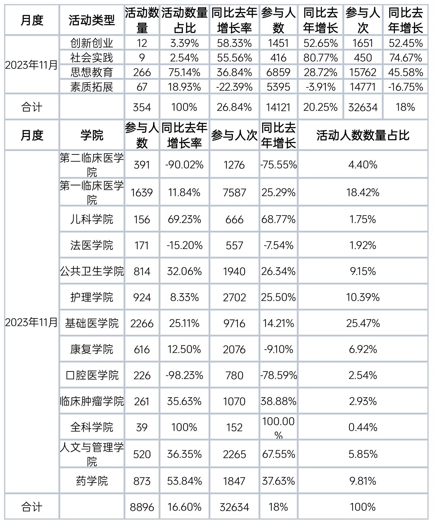 截至2023年11月30日,“第二课堂”平台共开展活动354项,参与人数14121人,参与人次32634次。