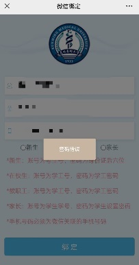 ②绑定账户,学生账号为学号,2023级初始密码为身份证号,选择“在校生”,点击绑定;