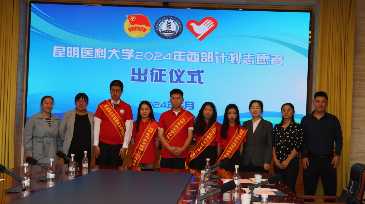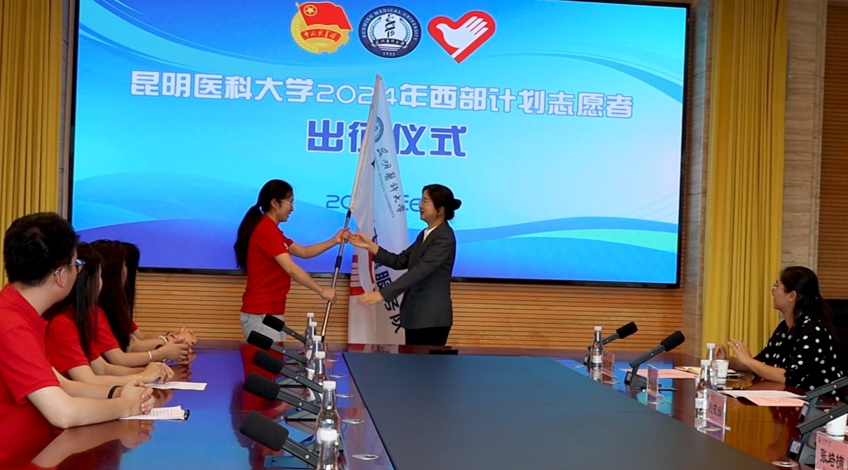 校领导为2024年西部计划志愿服务团和Beat365唯一官方网站第三届研支团授旗,为20名西部计划志愿者和6名研究生支教团成员颁发绶带。