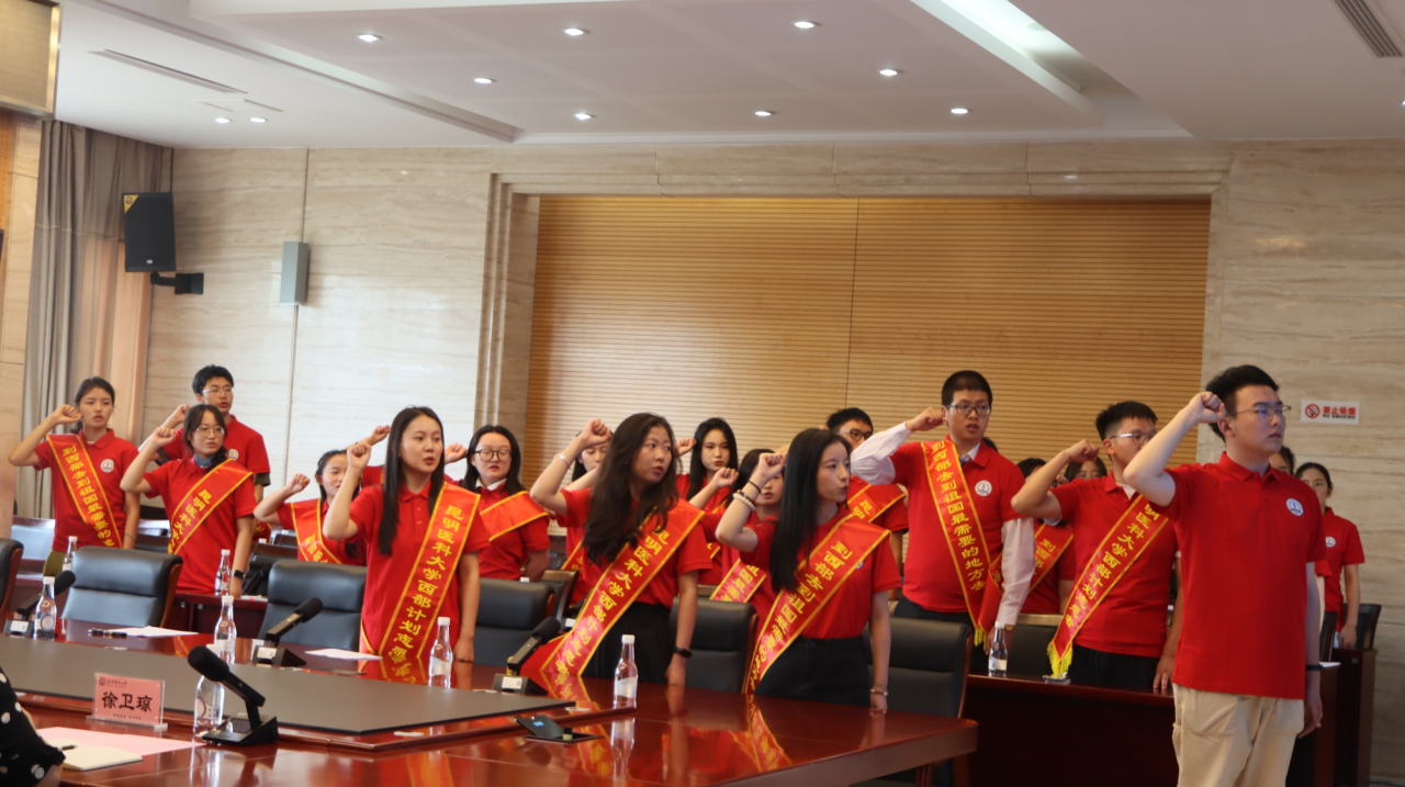 志愿者进行宣誓,铮铮誓言响彻校园,他们的青春将在党和人民需要的地方绽放出绚烂之花。