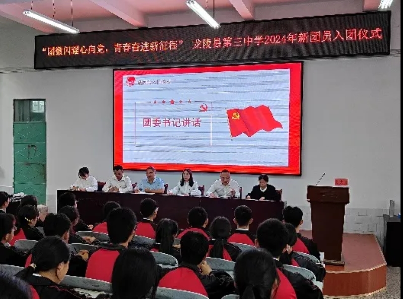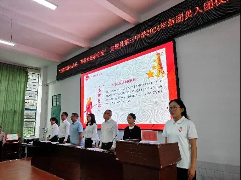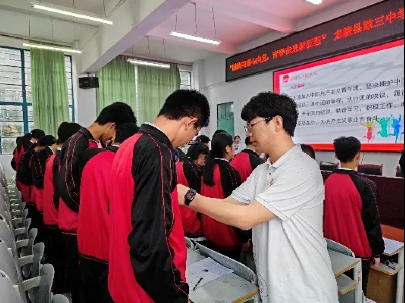 5月10日,共青团龙陵县第三中学委员会举办了以“团徽闪耀心向党,青春奋进新征程”为主题的2024年新团员集中入团仪式。研支团成员们策划参与了新团员集体入团仪式。李戎主持本次入团仪式,蒋金旭、施立凤作为教师代表为新团员佩戴团徽。