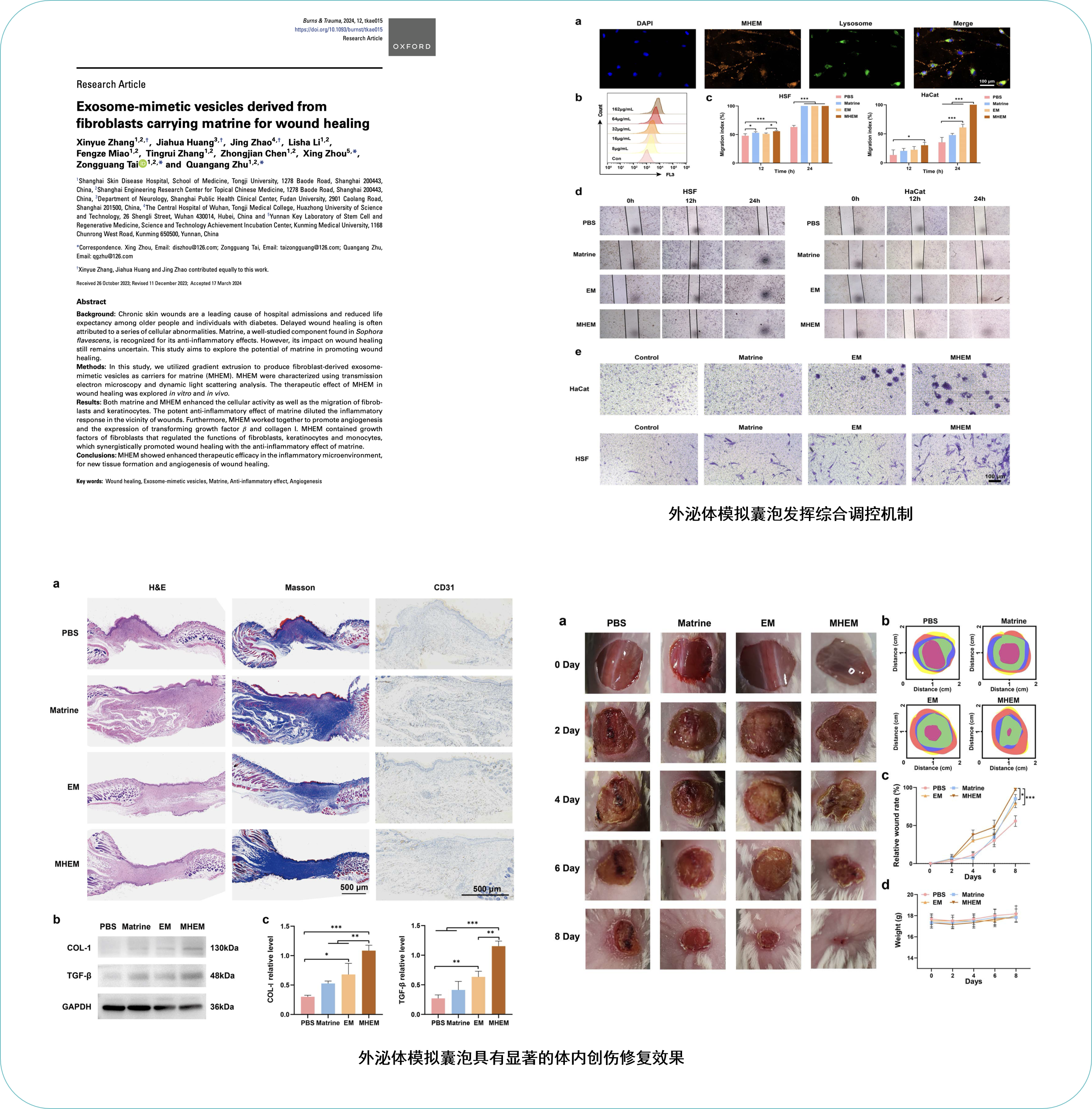 慢性皮肤伤口是导致老年人和糖尿病患者住院及预期寿命缩短的重要原因,其愈合延迟常与一系列细胞异常相关,尽管苦参碱的抗炎作用已被广泛研究,但其在伤口愈合中的作用仍不明确,且传统细胞生物技术因产量低、大规模生产困难和治疗效果不足等问题,临床应用受限。周兴教授团队开发了一种成纤维细胞来源的携带苦参碱的外泌体模拟囊泡(MHEM),通过体外和体内实验探讨其在伤口愈合中的治疗效果。研究发现,MHEM 兼具苦参碱的抗炎特性和成纤维细胞来源囊泡促进细胞迁移、血管生成及胶原沉积的功能,在炎症微环境中通过多阶段协同作用加速伤口愈合,包括抑制过度炎症、促进新组织形成和血管生成等。该研究不仅揭示了苦参碱通过调节炎症微环境促进伤口愈合的新机制,还通过外泌体模拟囊泡提升了药物递送效率,为慢性伤口治疗提供了一种结合中药活性成分与生物工程技术的创新策略,具有重要的科学意义和临床应用潜力。相关成果发表于国际烧伤领域权威期刊Burns & Trauma(中科院1区)。