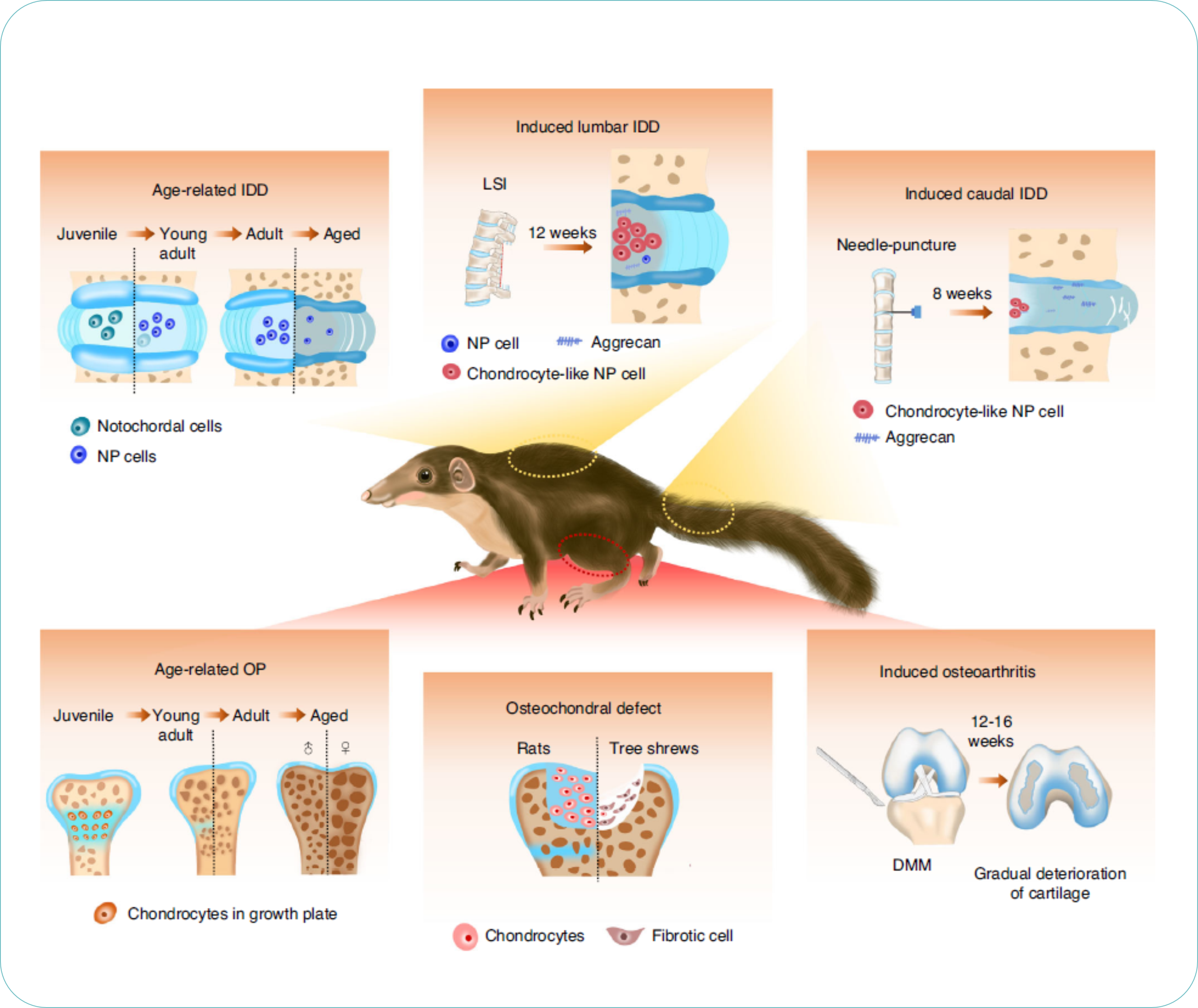 2025年1月2日,陆地、白晓春研究团队,通过构建多种动物模型探讨了树鼩作为研究肌肉骨骼疾病和衰老的新动物实验对象的潜力,研究成果以 “Tree shrew as a new animal model for musculoskeletal disorders and aging”为题发表在 Bone Research,IF=15.1杂志。树鼩是一种与灵长类动物有较近亲缘关系的小型哺乳动物,与灵长类动物比较,其自身具有体型小、繁殖周期短、易于实验操作、饲养成本低等特点。研究发现树鼩的骨骼生长和骨代谢与人类更为接近,其与常用的啮齿类动物模型存在显著差异。例如,树鼩的长骨生长板在成年后闭合,类似于人类,而啮齿类动物的生长板则存在更长时间乃至终生。另外,老年树鼩表现出与人类相似年龄相关的腰椎间盘退变(IDD)和骨质疏松变化。通过构建树鼩的骨软骨缺损、骨关节炎(OA)和两种IDD模型(腰椎失稳模型以及尾椎针刺模型),结果显示树鼩的骨软骨缺损愈合能力较差,表现出更接近于人类的修复情况,而啮齿类动物模型则表现出快速的自发愈合。此外,树鼩的OA模型能够高效且可重复地模拟人类OA的病理特征。在树鼩上两种IDD模型均能稳定构建椎间盘退变,及在不同时间点显示出不同程度的疾病严重程度,更接近临床状态。由此,该研究为树鼩作为研究肌肉骨骼疾病和衰老的新动物模型奠定了基础,为相关疾病的治疗研究提供了新的平台。