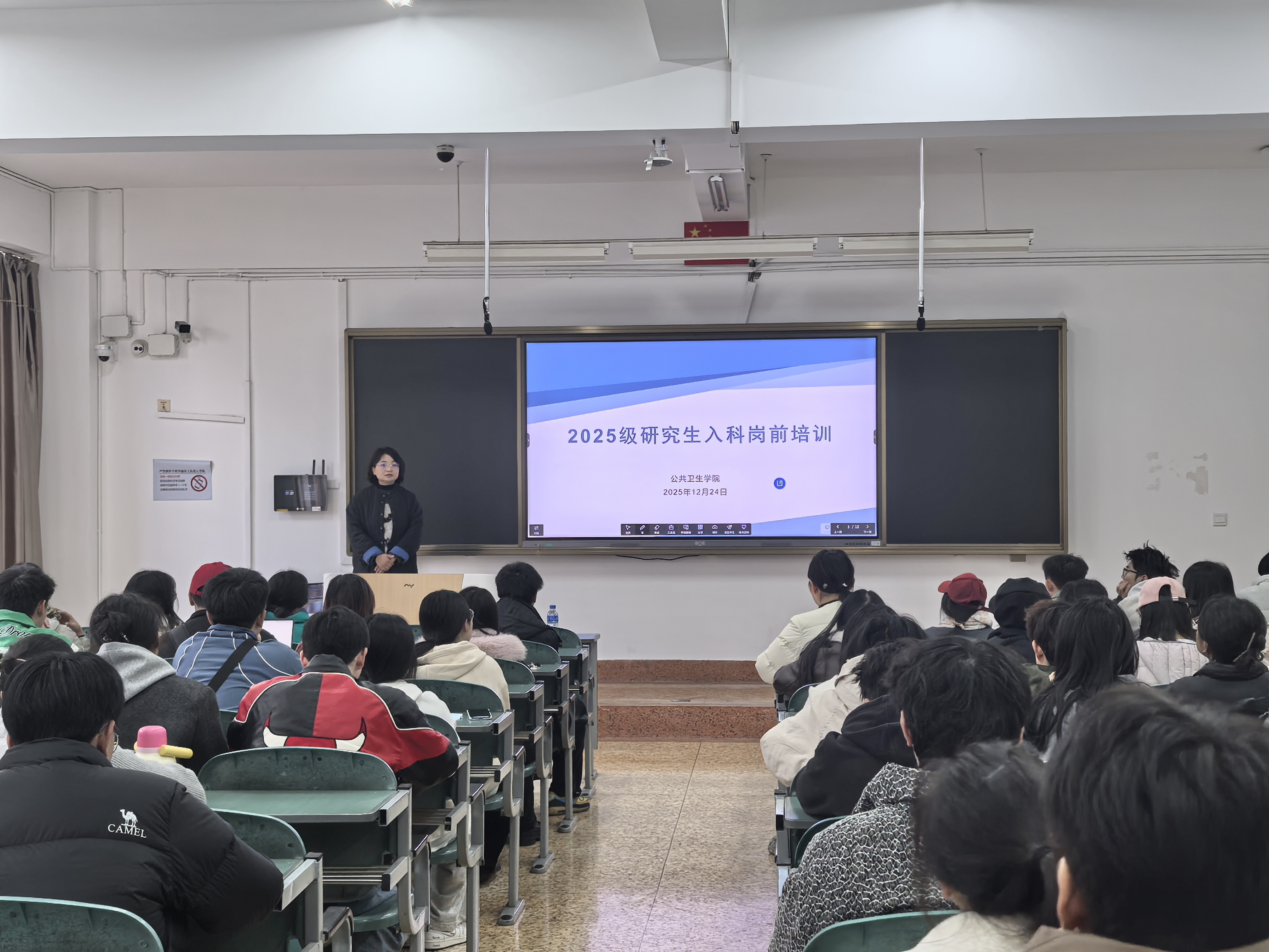 12月24日,公共卫生学院组织开展了2025级研究生入科岗前培训暨安全教育主题班会。学院副院长邓睿、学科科研与研究生管理办公室主任柏桦、研究生辅导员董文琳及2025级全体研究生共同参加了本次活动。