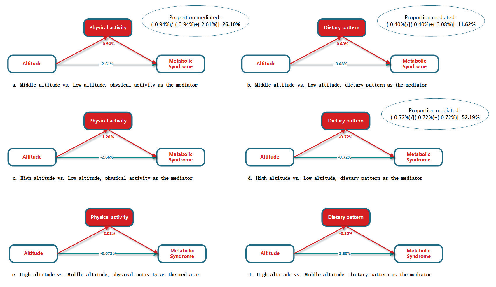图2 海拔和代谢综合征的体力活动及饮食模式中介分析
