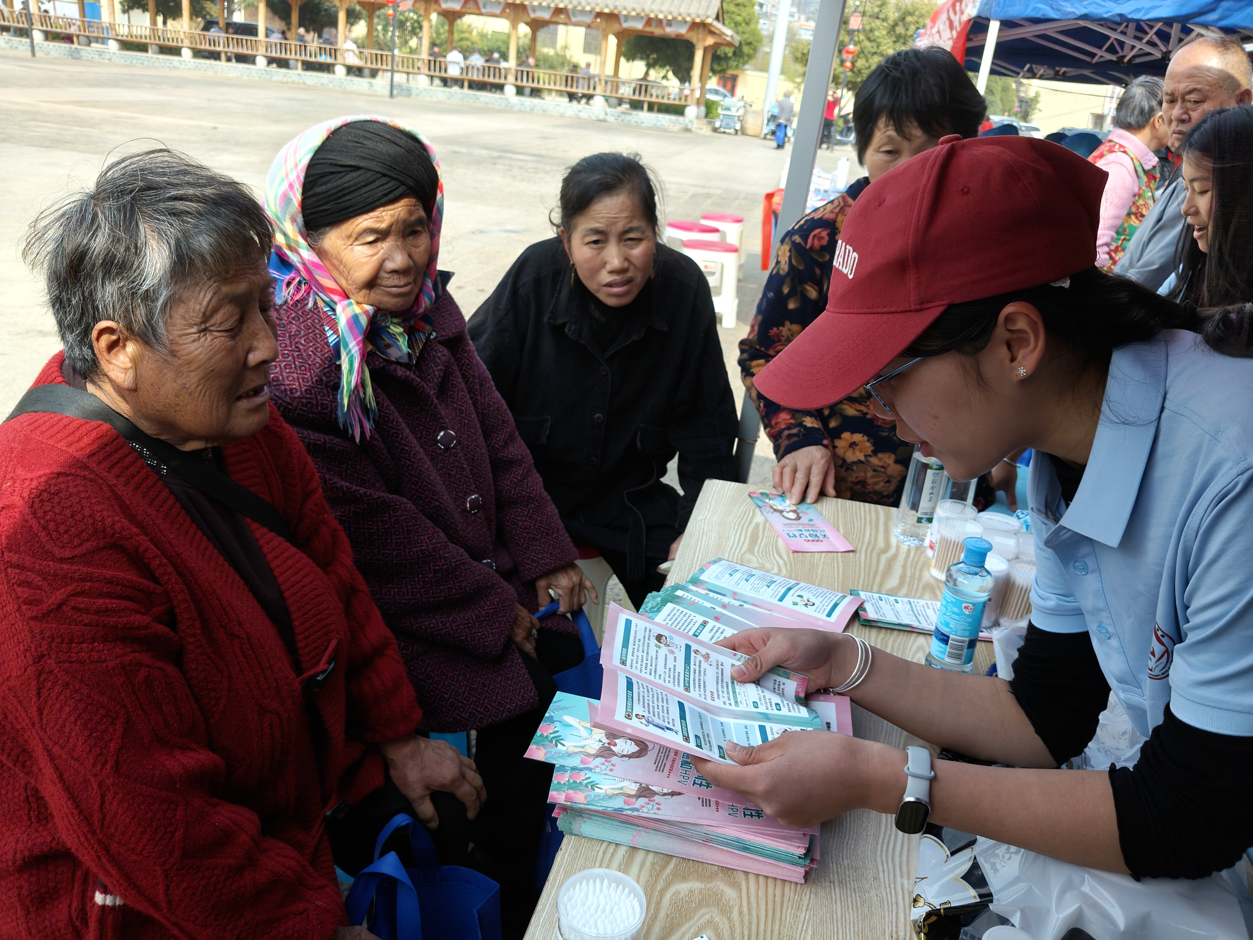 学院团队设立的健康咨询台前,志愿者们为居民测量血压、答疑解惑。“阿姨,您的血压控制得不错,但春季昼夜温差大,还是要按时服药、注意保暖。”针对社区中老年群体,志愿者们细致讲解高血压、糖尿病等慢性病的日常管理要点,手把手教授健康自测方法。在“三八”妇女节专题服务区域,一场关于女性健康的“微课堂”热烈开讲。志愿者们聚焦妇女保健和“两癌”防治,用通俗易懂的语言讲懂专业医学知识。从宫颈癌HPV疫苗的接种时机,到乳腺癌的自我检查手法;从疾病早期信号的识别,到定期筛查的必要性。图文并茂的宣传手册递到居民手中,“早预防、早发现、早治疗”的健康理念渐入人心。“这些娃娃讲得清楚、有耐心,我们听得懂、用得上!”刚咨询完的李阿姨连连称赞,团队累计发放健康资料200余份,服务居民近百人次。