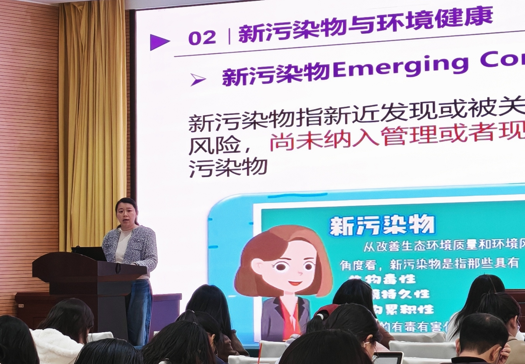 张艳老师从全球水体环境现状切入,系统阐述了新型污染物的环境行为与健康风险。她指出,以DDT、全氟化合物及PHMG为代表的典型新型污染物,不仅对生态系统构成长期威胁,更通过多种暴露途径危害人体健康。在此背景下,推动新污染物治理已成为全球共识与必然趋势。