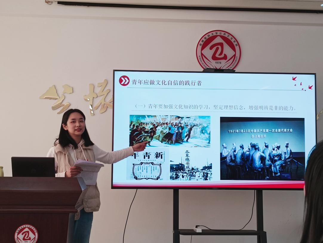 为激励广大学生从党的二十大精神中汲取前行的智慧和力量, 不断增强思想自觉和行动自觉,4月3日下午,学生第二党支部负责人马瑞老师在公共卫生学院学生中心进行了主题为《坚定文化自信,让青春脉搏与新时代同频共振》的党的二十大精神宣讲。