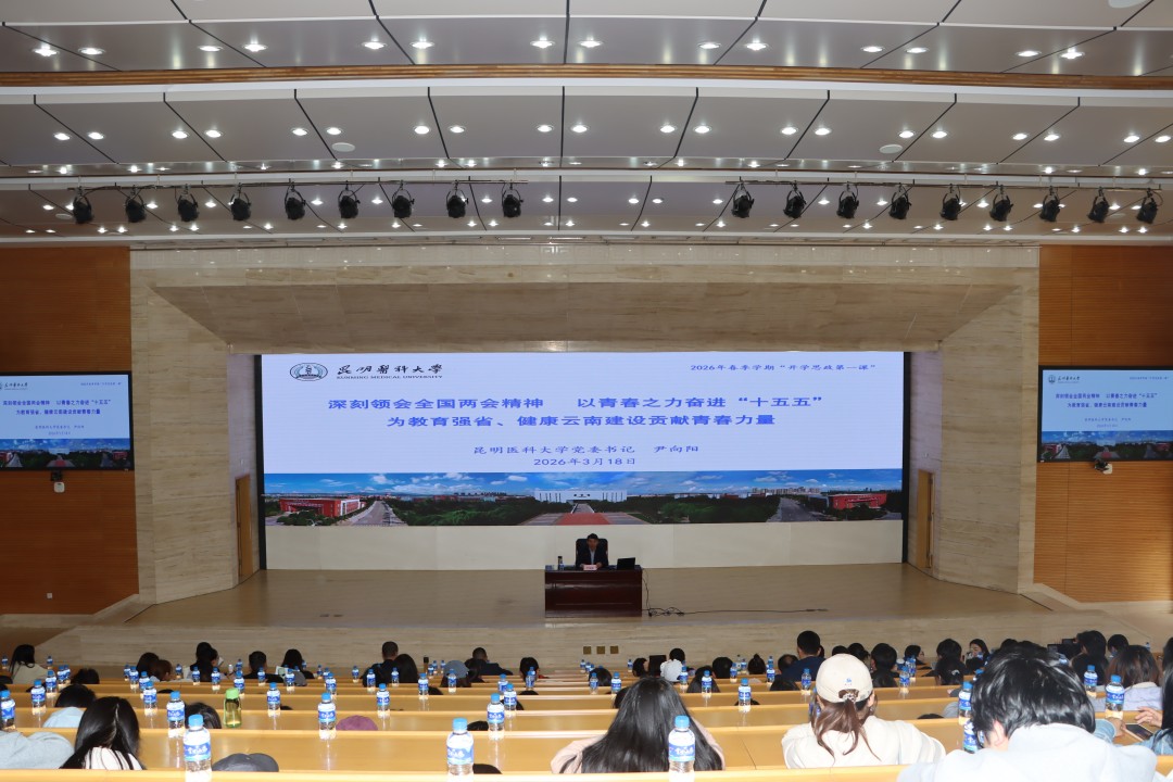 尹向阳以“深刻领会全国两会精神 以青春之力奋进‘十五五’为教育强省、健康云南建设贡献青春力量”为题,立足2026年全国两会精神,紧扣学校发展实际,围绕“认清国内外形势,读懂变乱世界中的‘中国之稳’”“把握发展大局,深刻领会2026年全国两会精神”“坚定发展信心,共同携手奋进学校‘十五五’”“勇担使命,为教育强省、健康云南建设贡献青春力量”4个方面展开讲授。尹向阳结合学校建设发展、契合师生关切的具体案例,以深入浅出的语言剖析了当前国际、国内形势,分析了学校建设面临的机遇与挑战,详细解读了学校“十五五”重点任务,为学生未来的专业成长与能力跃升擘画了清晰蓝图。