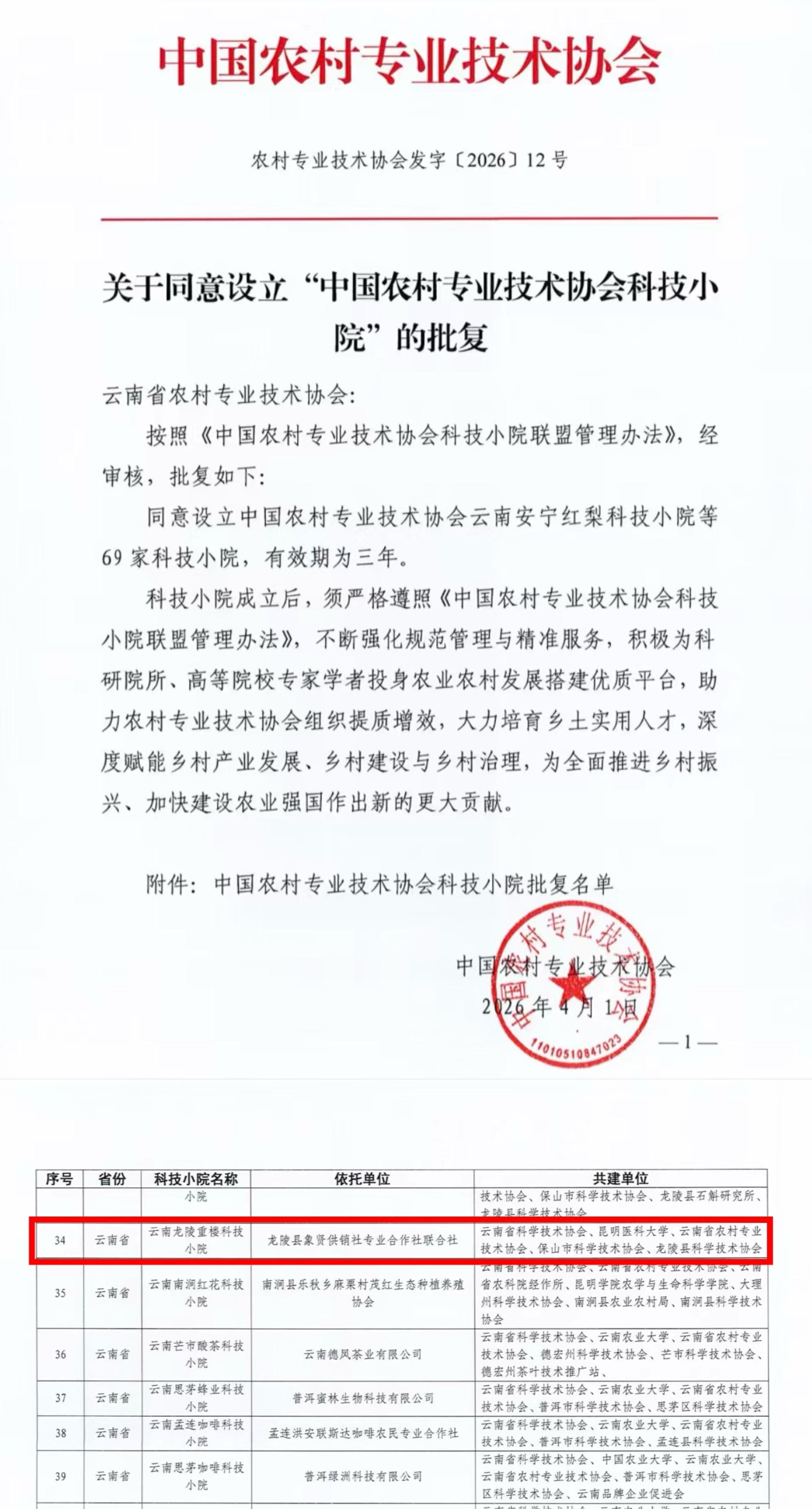 近日,中国农村专业技术协会发布《关于同意设立“中国农村专业技术协会科技小院”的批复》,同意云南省设立69家科技小院,Beat365唯一官方网站“云南龙陵重楼科技小院”获批。这是学校首次获批国家级科技小院,也是学校连续10年定点帮扶龙陵县象达镇,助力乡村振兴的重要标志性成果。