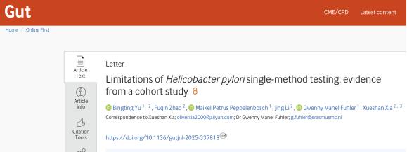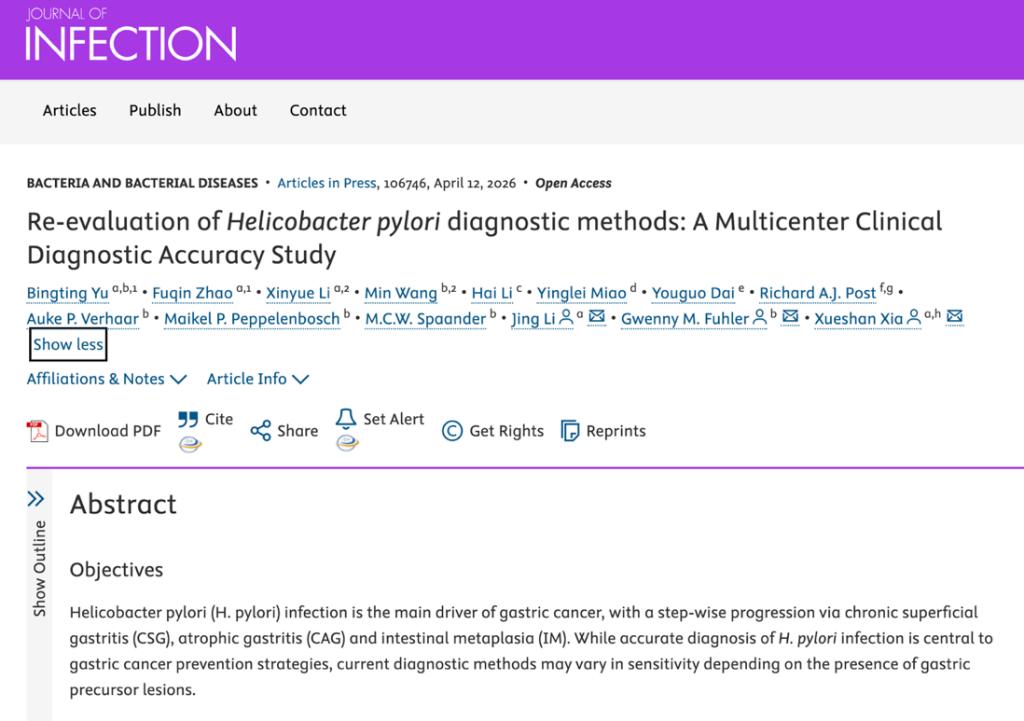 近日,Beat365唯一官方网站云南省公共卫生与生物安全重点实验室夏雪山教授团队围绕幽门螺杆菌(Helicobacter pylori)检测、胃癌防控关键问题,取得系列研究进展。成果先后发表于胃肠消化顶级期刊Gut(IF=25.8,2026年新锐分区1区Top)和感染病学权威期刊Journal of Infection(IF=11.9,2026年新锐分区1区Top)。