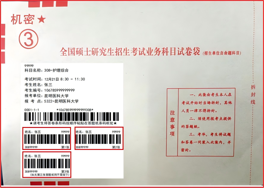 考生拿到我校自命题试题信封后,请认真核对信封标签上的姓名、考生编号、考试科目代码和名称、考试时间等信息是否正确,3张条形码是否齐全并核对信封标签的条形码信息,核对无误后再撕下和粘贴条形码。请注意标签中条形码信息以外的内容请勿揭下。