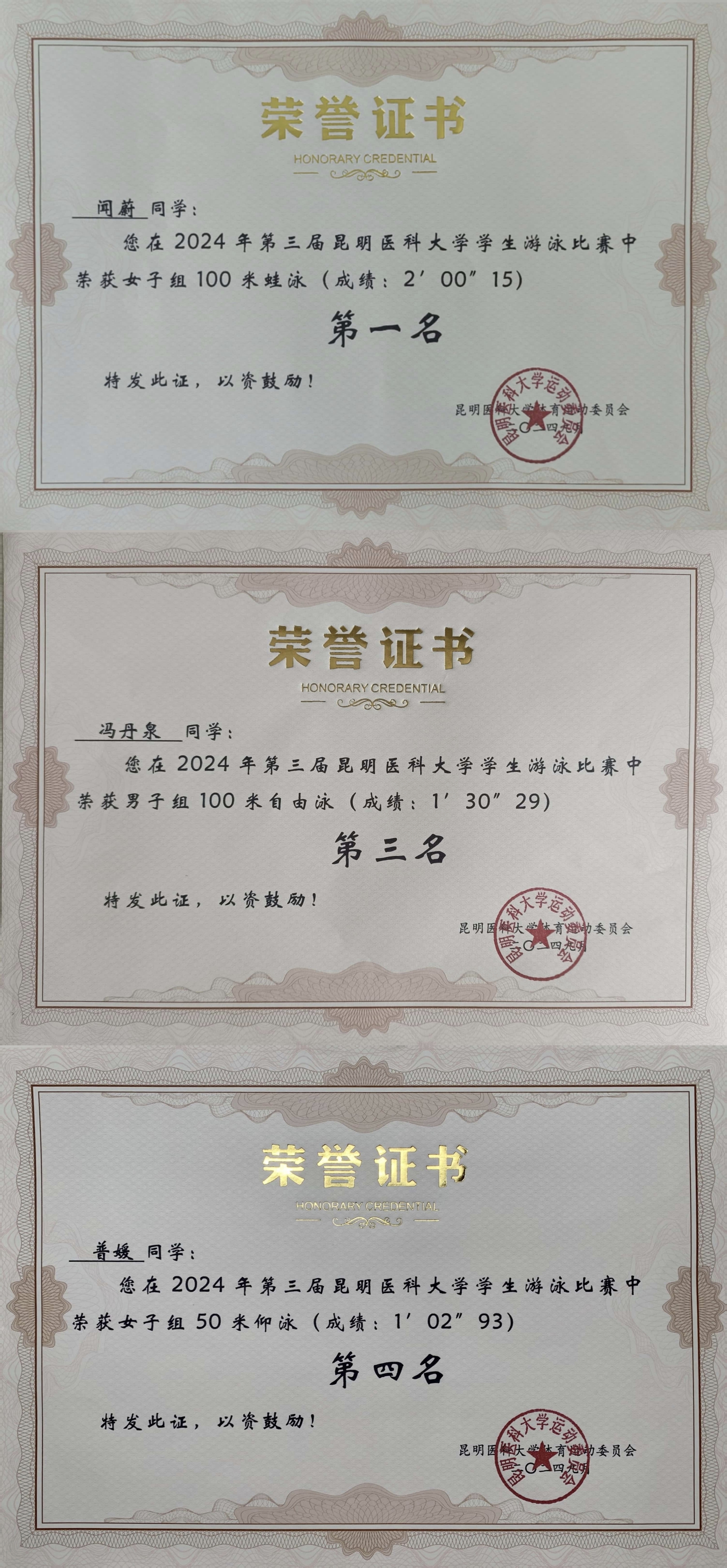研究生院队各位同学在比赛中展现出良好的精神面貌和竞技状态。经过激烈的角逐,附属延安医院2023级研究生闻蔚同时取得女子100米蛙泳第一名及女子100米自由泳第四名、第六附属医院2024级研究生冯丹泉同时取得男子100米自由泳第三名及男子50米自由泳第七名、第六附属医院2023级研究生普媛获得女子50米仰泳第四名、联勤保障部队第九二〇医院2024级研究生韩育德取得男子50米仰泳第八名的好成绩。