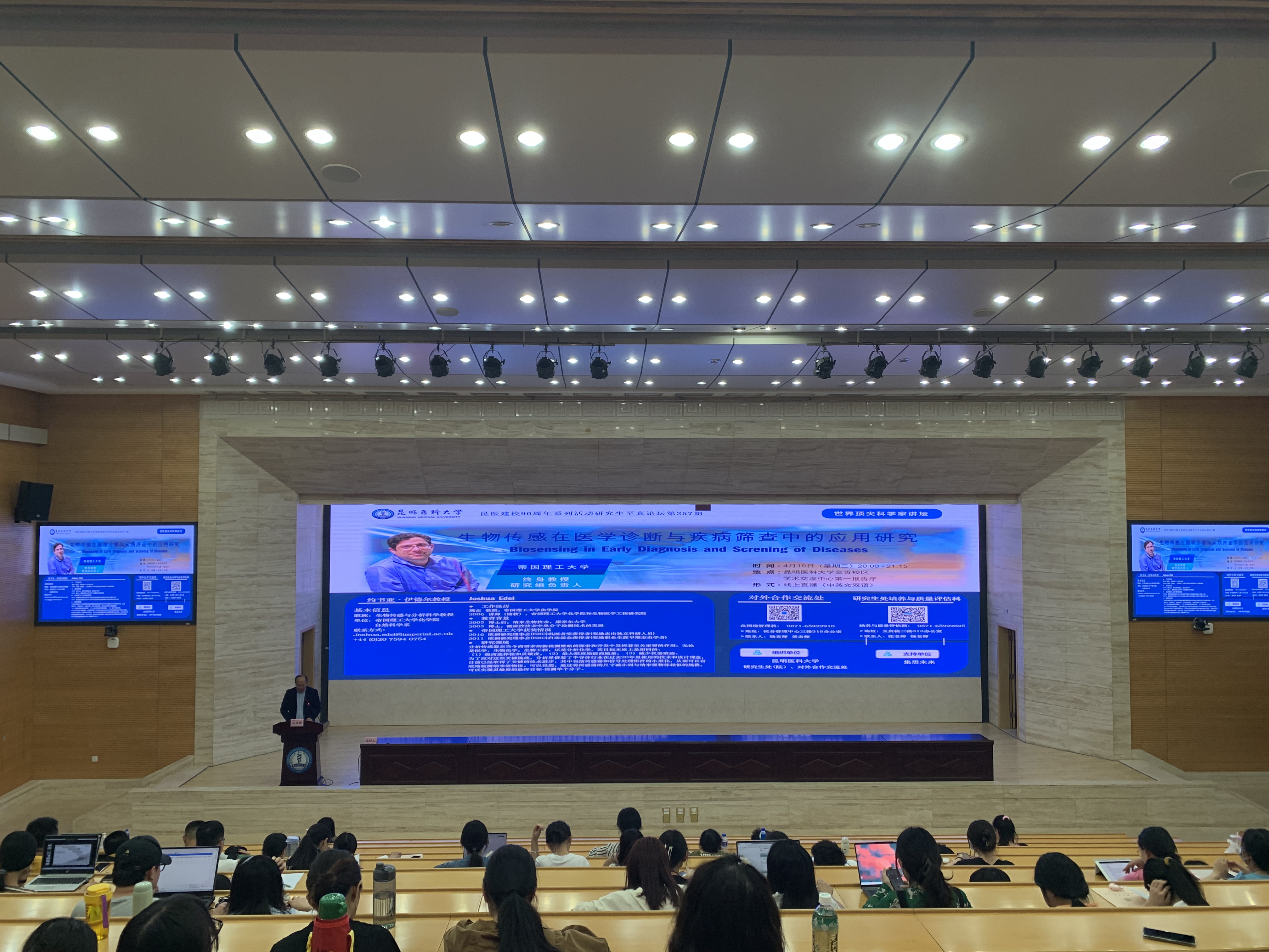 为培养具有国际视野、全球胜任力和国际竞争力的高层次拔尖创新人才,营造良好的学术氛围,2023年4月19日晚,研究生处(院)、对外合作交流处在呈贡校区学术交流中心第一报告厅举办昆医建校90周年系列活动之研究生至真论坛第257期—世界顶尖科学家讲坛。本场讲座邀请英国帝国理工大学约书亚·伊德尔教授(Prof. Joshua Edel)进行了题为“生物传感在医学诊断与疾病筛查中的应用研究”的讲座。