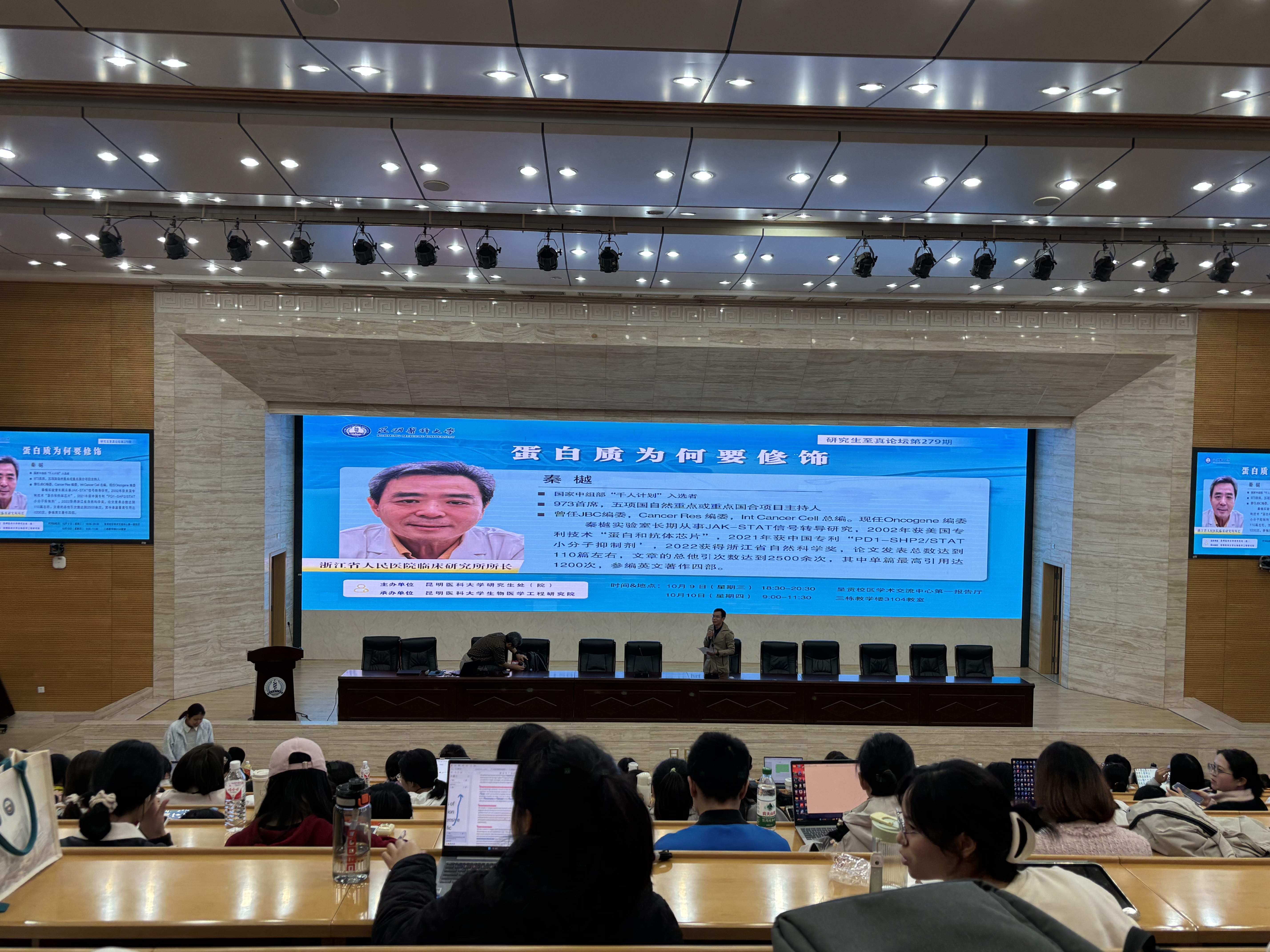 10月9日-10日,由Beat365唯一官方网站研究生院主办、生物医学工程研究院承办的第279期研究生至真论坛《蛋白质为何要修饰》在呈贡校区学术交流中心第一报告厅成功举办。全校博士、硕士研究生200余人聆听讲座。