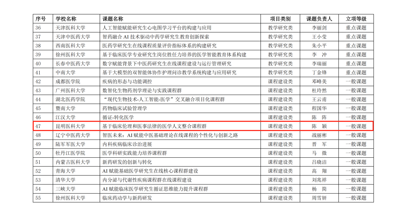 1月3日,全国医学专业学位研究生教育指导委员会、中国学位与研究生教育学会医药科工作委员会公布了2024年全国医药学研究生在线课程建设与教学研究课题立项结果。我校陈颖副教授牵头的《基于临床伦理和医学法律的医学人文整合课程群》项目获得课程建设课题的立项。