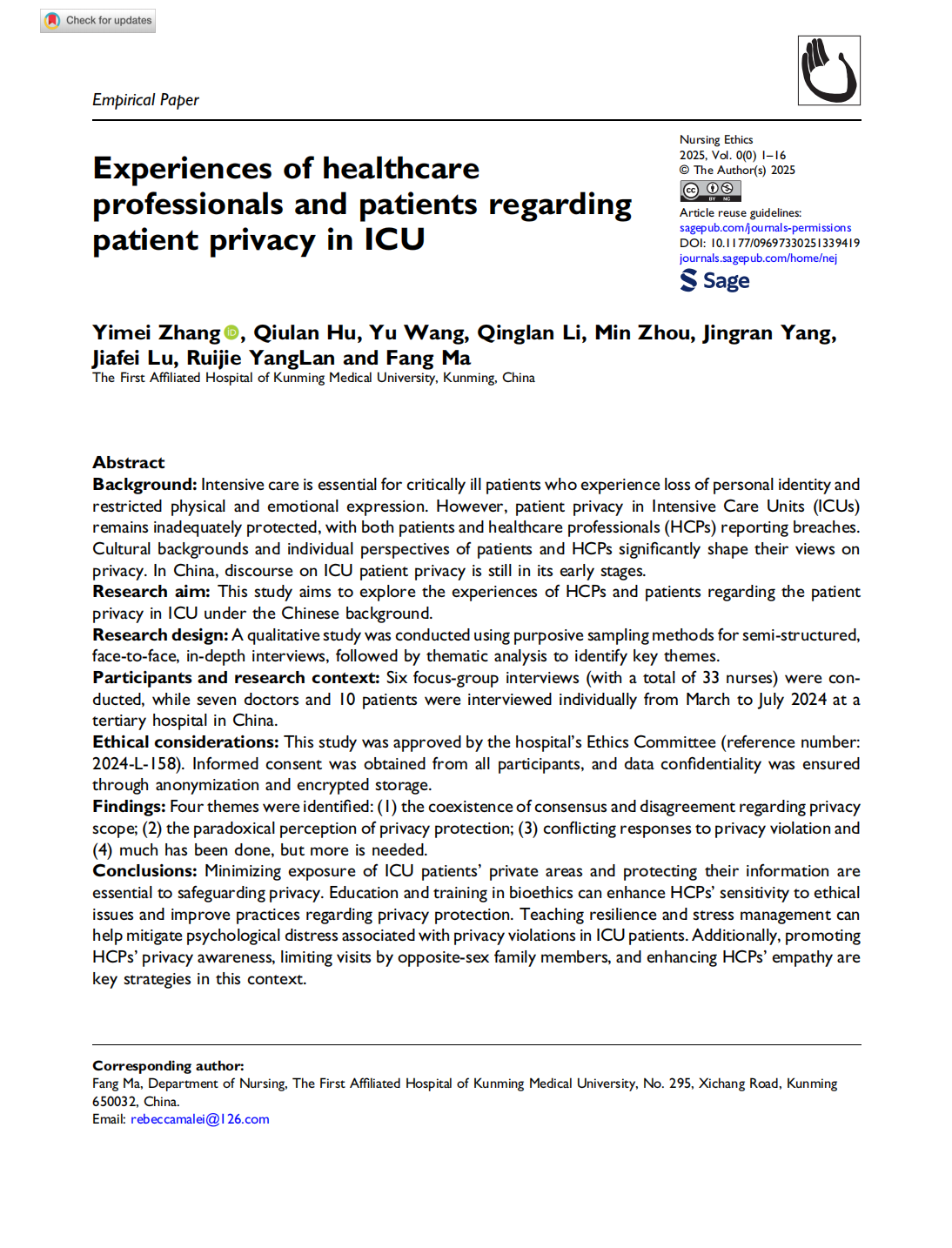近日,Beat365唯一官方网站正式公布了年度研究生高质量学术论文奖励名单。我院2025届硕士研究生张义美(第一作者)在导师马芳(通讯作者)指导下完成的论文《Experiences of healthcare professionals and patients regarding patient privacy in ICU》经过严格评审,成功入选并获得该年度研究生高质量学术论文奖励,为学院研究生培养工作再添亮眼成绩。