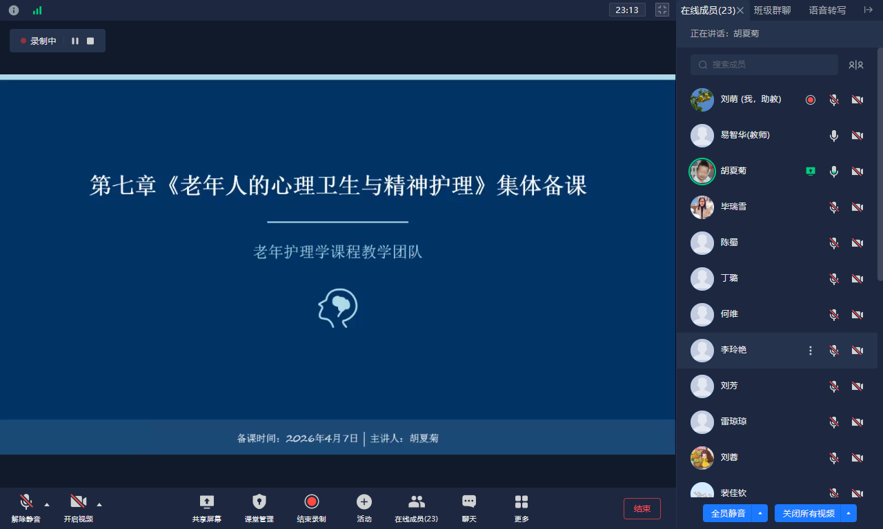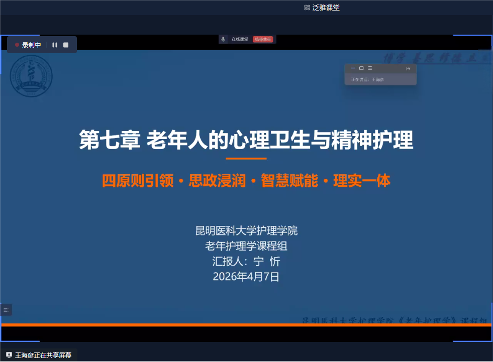 4月7日,护理学院在学院会议室成功举办《老年护理学》多院校联合虚拟教研室集体备课活动。活动特邀南昌大学老年护理学相关课程群虚拟教研室成员单位——赣南医科大学、江西中医药大学、湖南师范大学、杭州师范大学、甘肃中医药大学、河北中医药大学等11所高校的骨干教师,围绕《老年护理学》第七章《老年人的心理卫生与精神护理》开展跨区域教学研讨。学院副院长陶慧、各教研室专任教师及各院校相关课程骨干教师近50人参加会议。