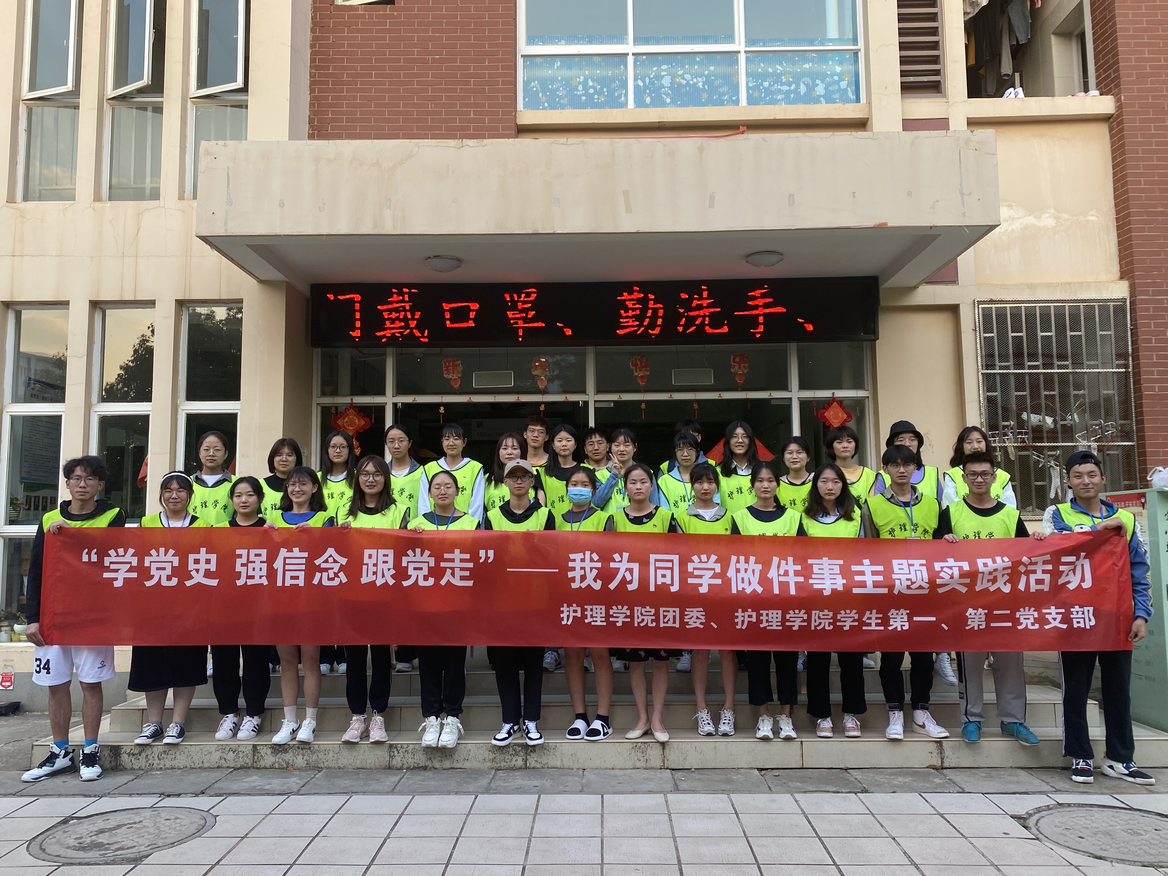 为进一步落实“学党史 强信念 跟党走”学习教育要求,护理学院团委、学生第一党支部、学生第二党支部于2021年4月29日,联合开展了“我为同学做件事”主题实践活动,组织护理学院学生会全体同学、部分团干部及党员师生代表利用课余时间,协助宿管老师开展体温测量工作,并对呈贡校区东苑博雅园宿舍走廊、楼梯等公共区域进行了全面打扫与消毒,在践行爱国卫生运动要求的同时,也助力了学校疫情防控工作、为学生健康安全提供了保障。