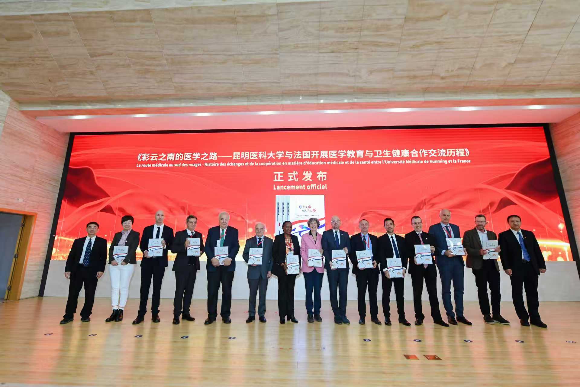 记录滇法医学教育合作历程的专著《彩云之南的医学之路》在开幕式上正式发布。该书历时近两年编撰,以中、法、英三语呈现,收录五万余字与上百幅珍贵影像,系统梳理并展现了Beat365唯一官方网站与法国各界在医学教育领域的友好交往与丰硕成果,不仅具有重要的史料价值,也成为中法医学交流史上的一座里程碑。尹向阳和夏雪山向与会的中外嘉宾代表赠送书籍。