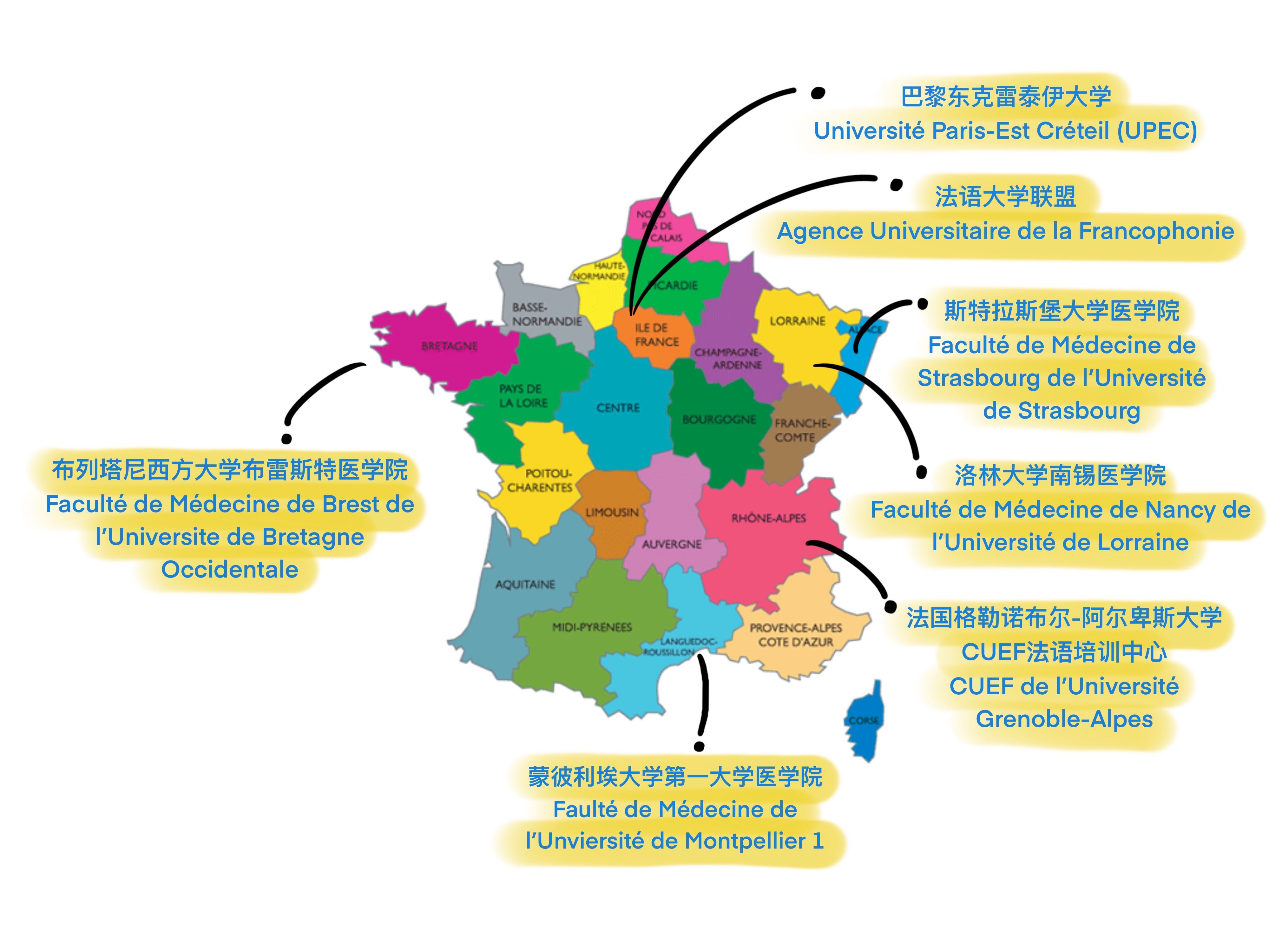 Depuis 1999, plus de 70 étudiants ont été envoyés pour des stages d’une durée de deux à trois mois dans des h?pitaux tels que : l’H?pital Pitié-Salpêtrière (Université Pierre et Marie Curie – Paris VI), le Centre Hospitalier Universitaire de Strasbourg, le Centre Hospitalier Universitaire de Nancy (Université de Lorraine), et le CHU de Brest (Université de Bretagne Occidentale).