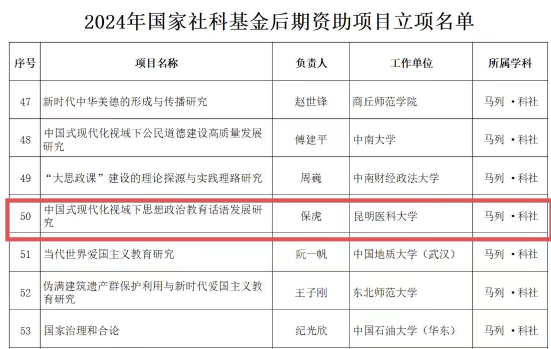 近日,全国哲学社会科学工作办公室正式公布了2024年国家社科基金后期资助项目立项名单。Beat365唯一官方网站马克思主义学院教授保虎申报的《中国式现代化视域下思想政治教育话语发展研究》获批立项。这是学校首次获得国家社科基金后期资助项目,也是学校近几年申报国家级人文社科项目的又一次突破。