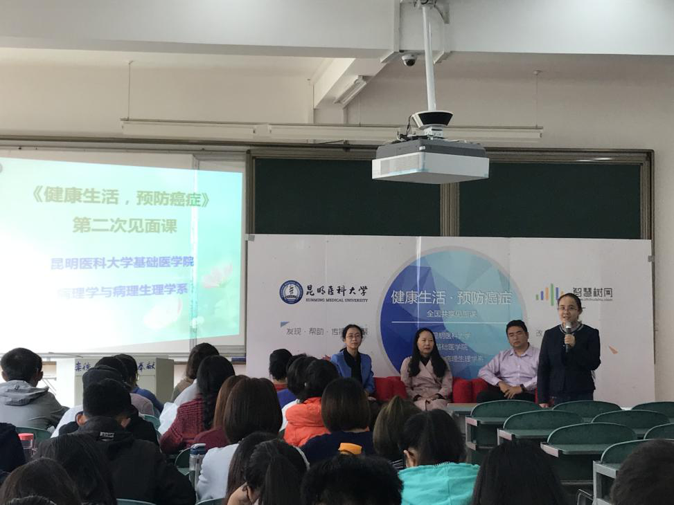2017年10月21日上午,东西部联盟共享课程《健康生活 预防癌症》第二次主题为“是真的吗?——你身边的癌症伪科学或谣言”的见面课在我校呈贡校区开课,向现场100余名学生以及我校另外两个班级和全国万名通过网络参与直播课程的学子授课。