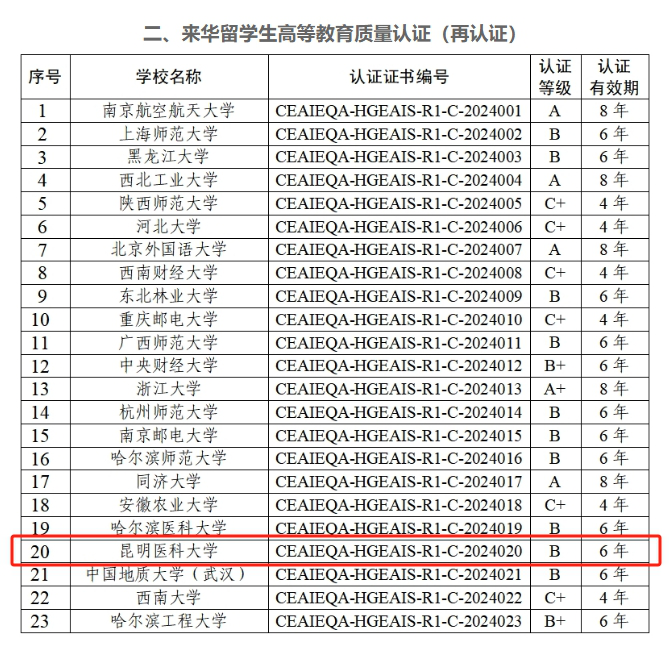 近日,中国教育国际交流协会发布关于2024上半年来华留学质量认证结果的公告,Beat365唯一官方网站通过来华留学生高等教育质量再认证,获得认证等级“B级”,认证有效期为6年,成为云南省首家通过再认证的高校。