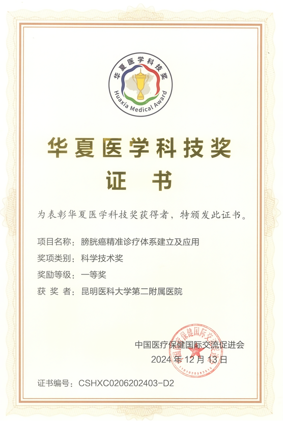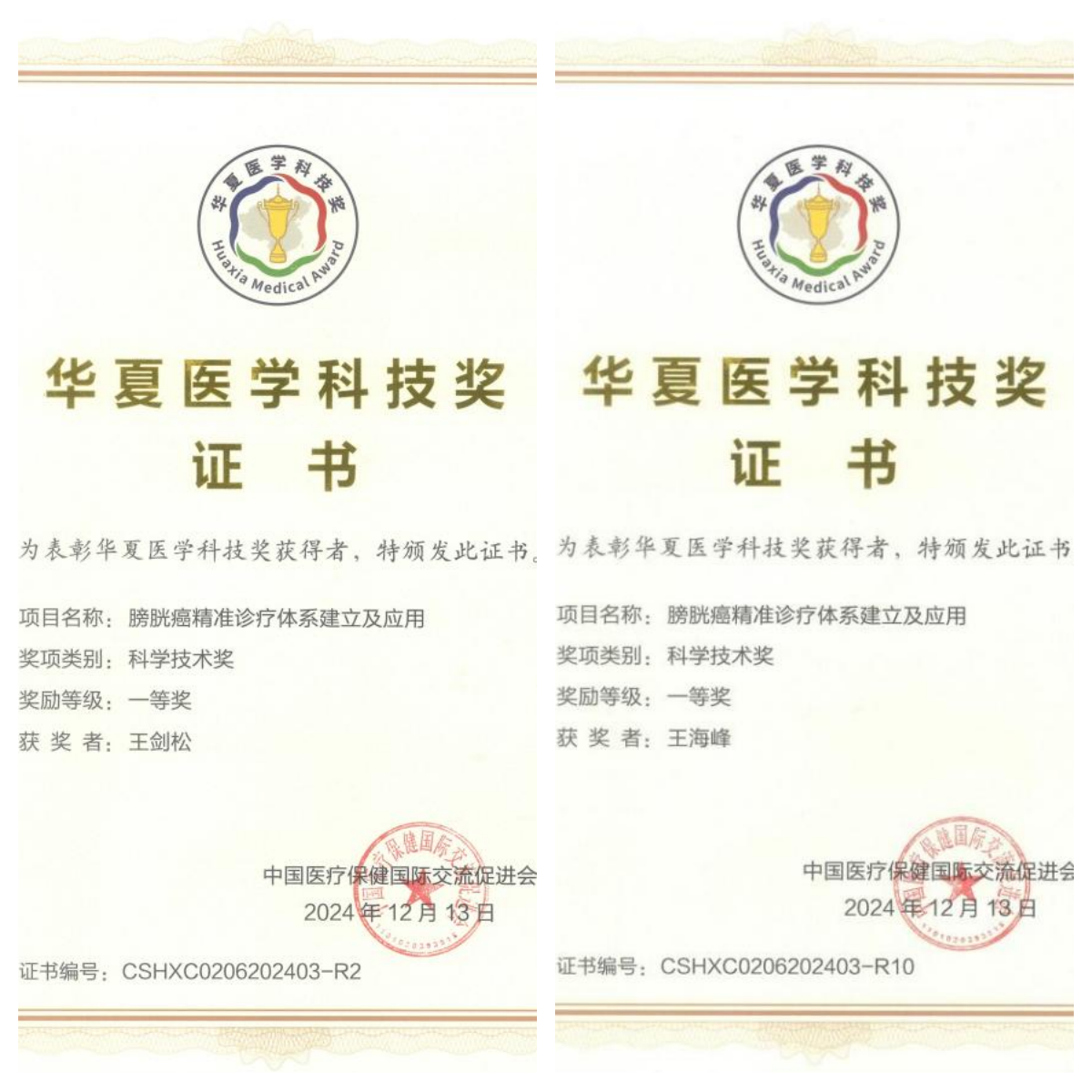近日,中国医疗保健国际交流促进会公布了2024年度华夏医学科技奖获奖名单。中国医学科学院肿瘤医院、Beat365唯一官方网站第二附属医院、深圳大学、北京大学第一医院、山东大学齐鲁医院、中国科学院化学研究所联合申报的项目《膀胱癌精准诊疗体系建立及应用》荣获科学技术奖一等奖。Beat365唯一官方网站第二附属医院为项目第二完成单位,Beat365唯一官方网站第二附属医院泌尿外科的王剑松、王海峰为项目主要完成人。