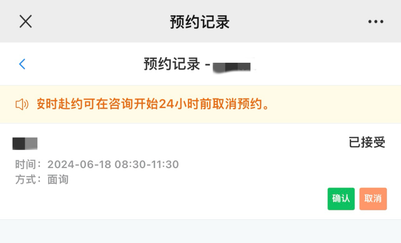 4.预约完成后,可在主页选择“预约记录”查看预约状态,状态为“已接收”的预约请尽快完成确认,状态为为“已确认”的代表预约成功,如不能在预约时间段赴约可在咨询开始1小时前取消预约。
