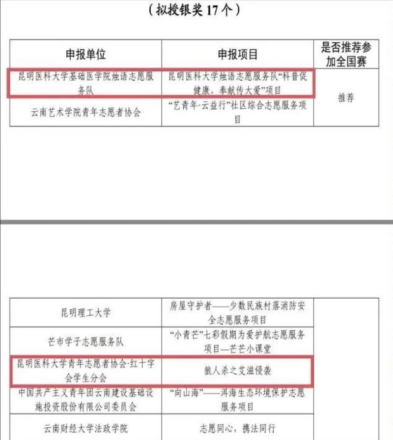 最终,我校项目在第六届中国青年志愿服务项目大赛云南地方赛暨2022年志愿服务交流会决赛中共获得银奖2项,铜奖2项,优秀奖1项,其中烛语志愿服务队“科普促健康,奉献传大爱”项目、狼人杀之艾滋侵袭两个项目进入国赛,角逐全国奖。