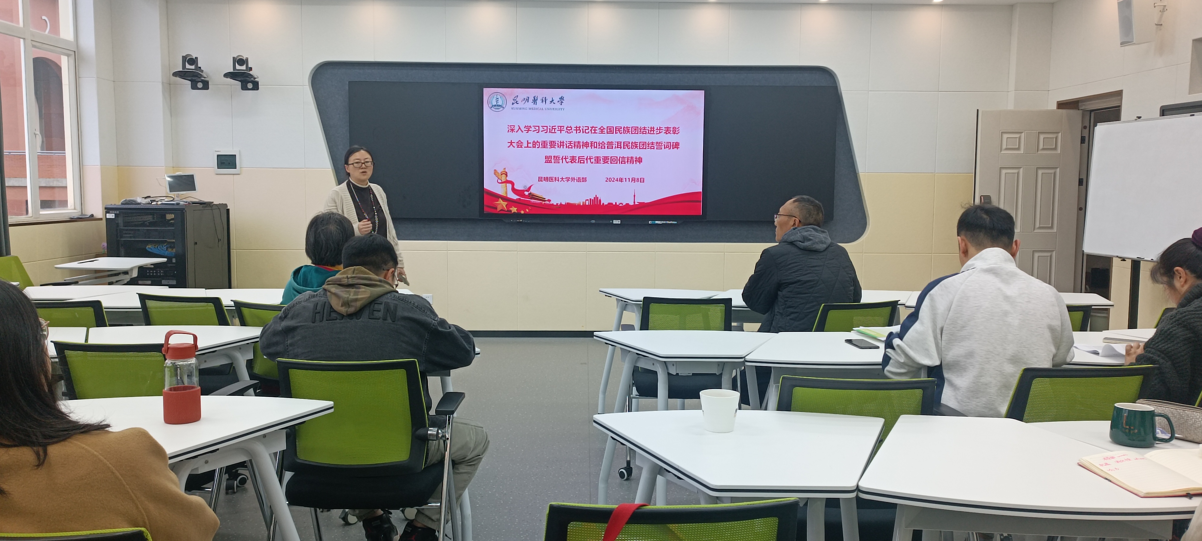 11月8日,外语部组织全体教职工深入学习习近平总书记在全国民族团结进步表彰大会上的重要讲话精神和给普洱民族团结誓词碑盟誓代表后代重要回信精神,外语部全体教职工、民主党派人士,统战部留联会会长参加学习。