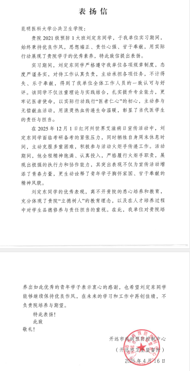 退役不褪色 青春显担当 公共卫生学院本科生刘定东获实习单位表扬