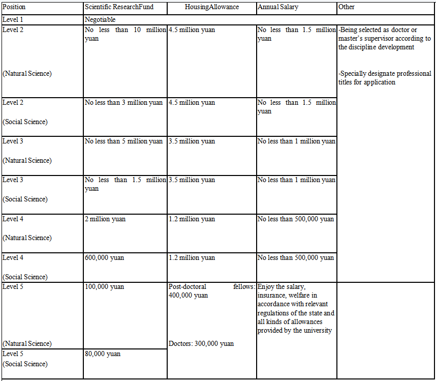 -Talents who meet the requirements of Level 1to Level 3 and complete stipulated tasks will be respectively paid 60,000 /50,000 /40,000 yuan per month. (The above salary should be paid after being evaluated in accordance with the contract or agreement)